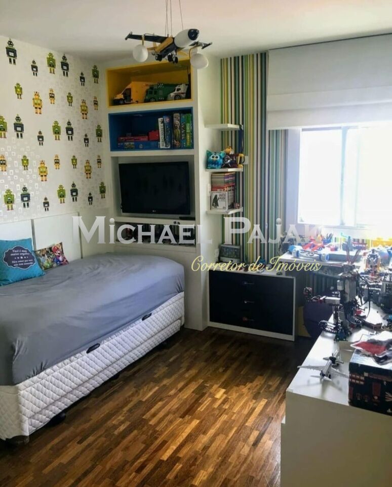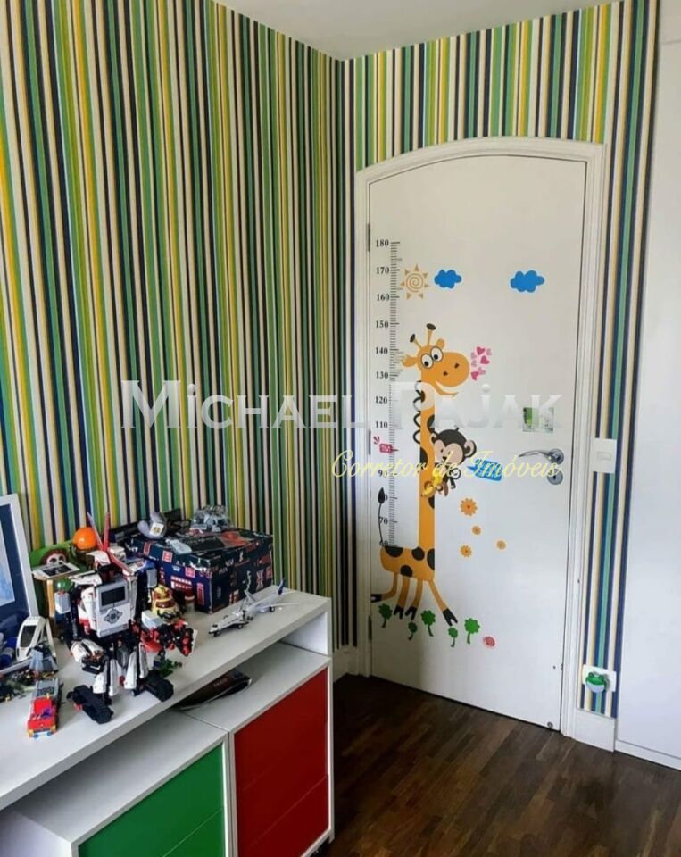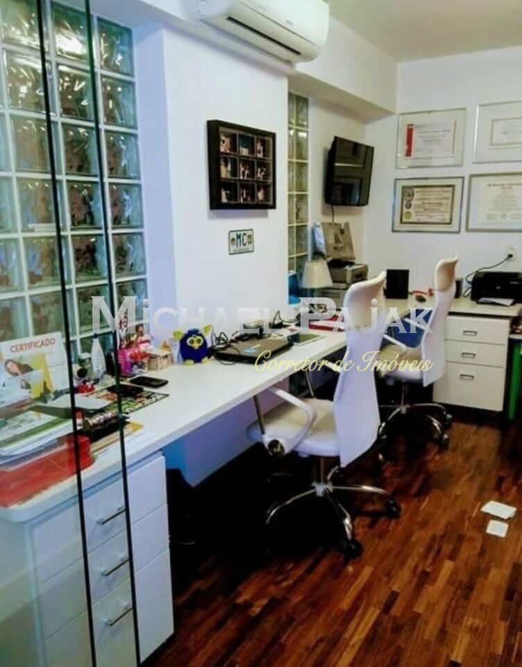 São 3 quartos, sendo 1suíte, 4 banheiros, cozinha americana, dispensa, sala de jantar, sala de visitas e sala de TV. Escritório.
