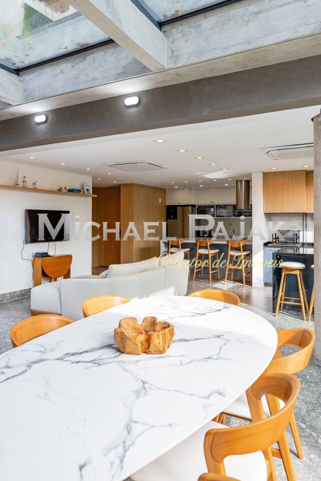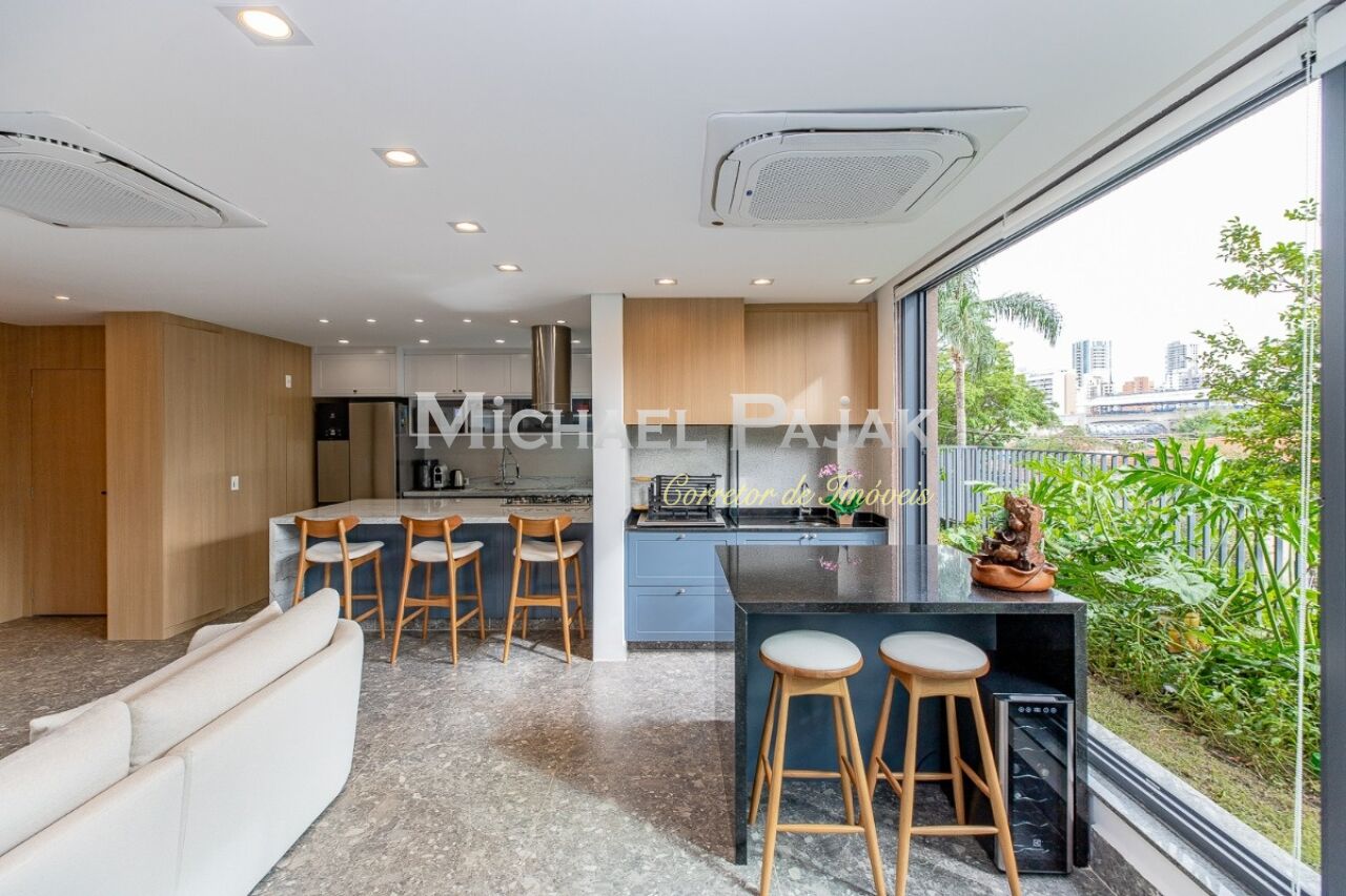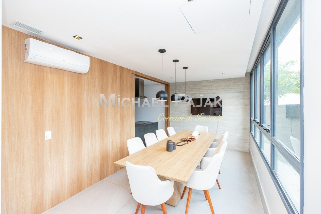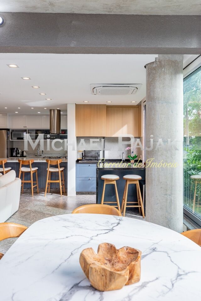 O living é um dos grandes destaques deste imóvel, com uma sala de jantar e estar amplas e climatizadas, que oferecem um ambiente sofisticado e acolhedor. O piso em porcelanato Portobello Pietra confere ainda mais elegância aos espaços, que são iluminados por janelas grandes voltadas para o jardim, permitindo que a luz natural preencha os cômodos durante todo o dia. A cozinha americana é moderna e funcional, equipada com cooktop e coifa na ilha central, além de muitos armários planejados, proporcionando praticidade e organização no preparo das refeições. O imóvel ainda conta com um lavabo decorado, ideal para receber visitas com conforto., lavanderia e 2 vagas de garagem.