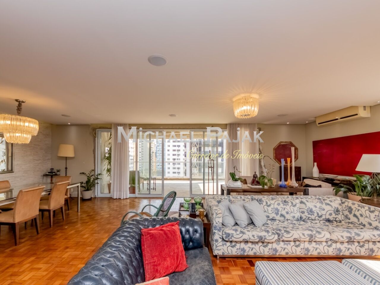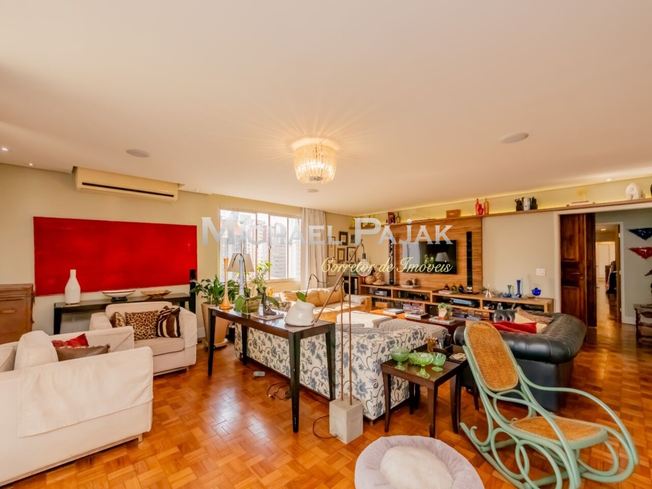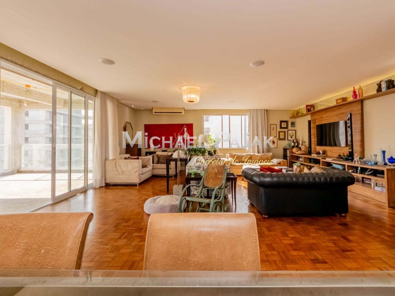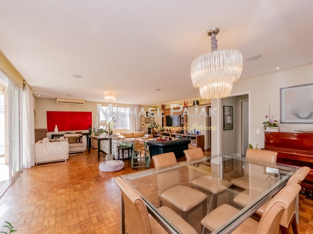 Pé direito muito alto e o piso em tacos de peroba rosa.