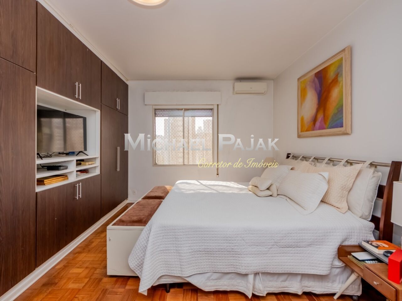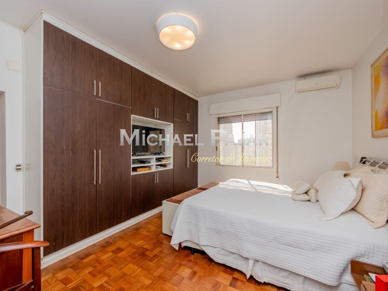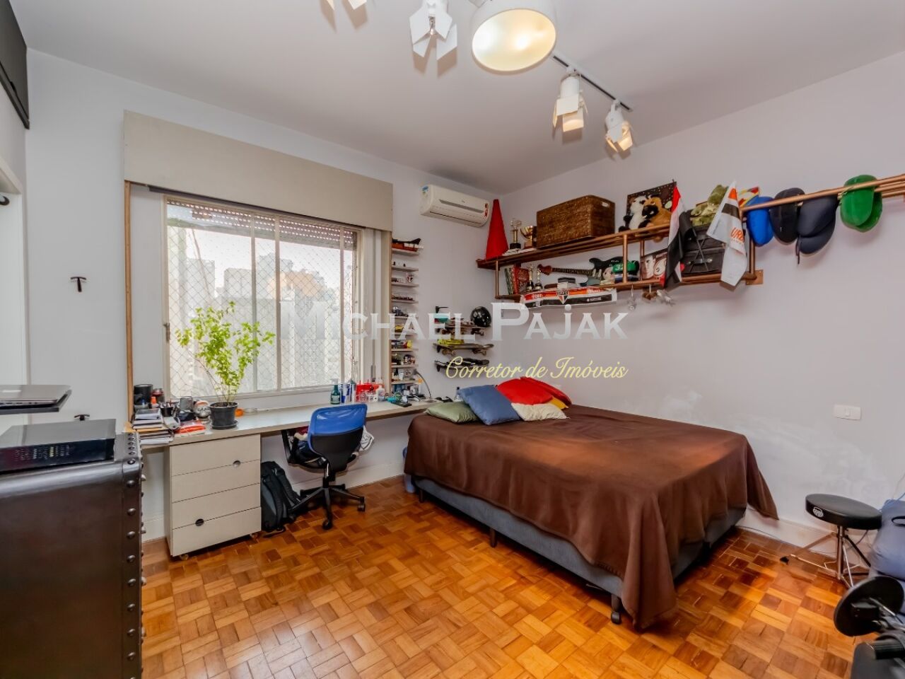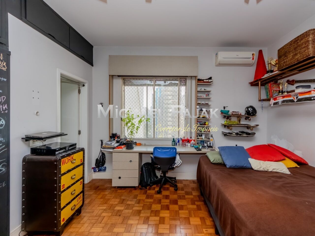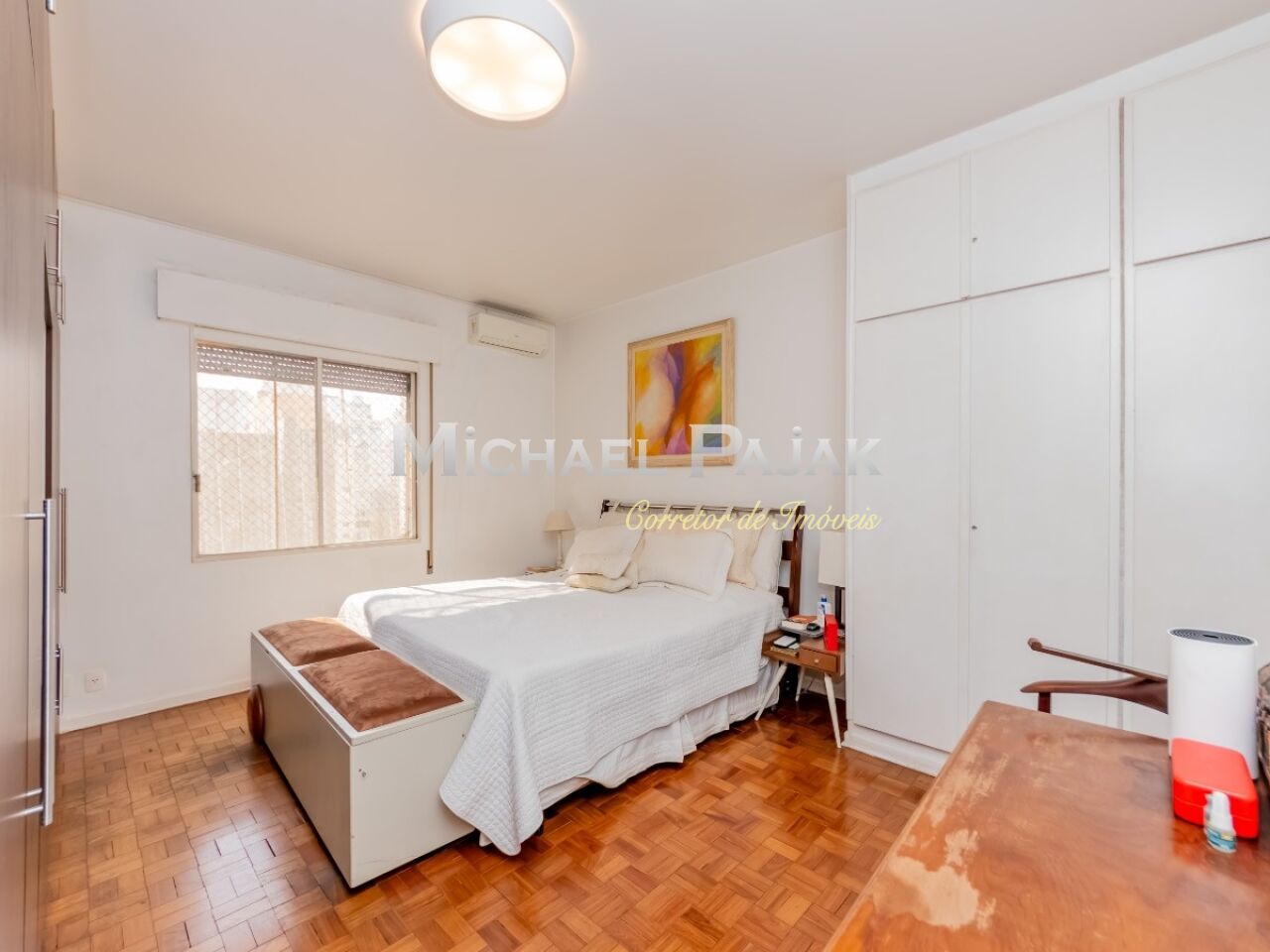 São três quartos grandes, todos suítes, com ar condicionado, armários e uma delas com amplo closet e espaço para escritório.