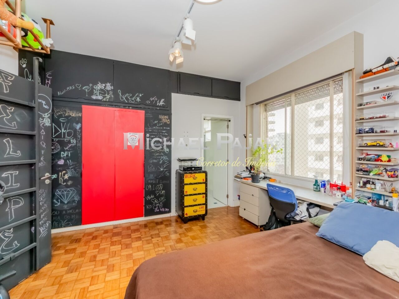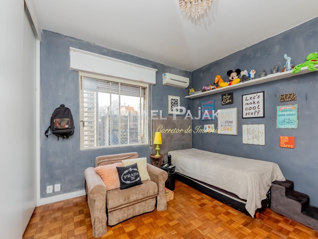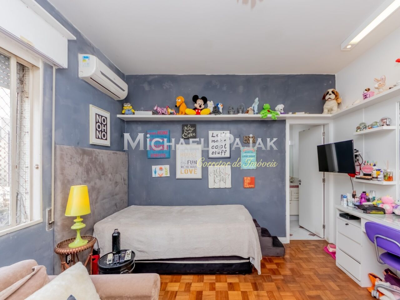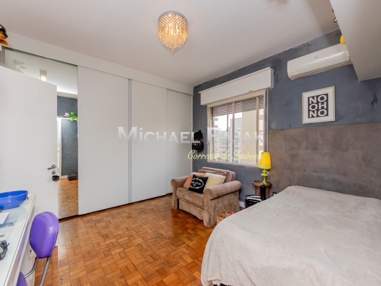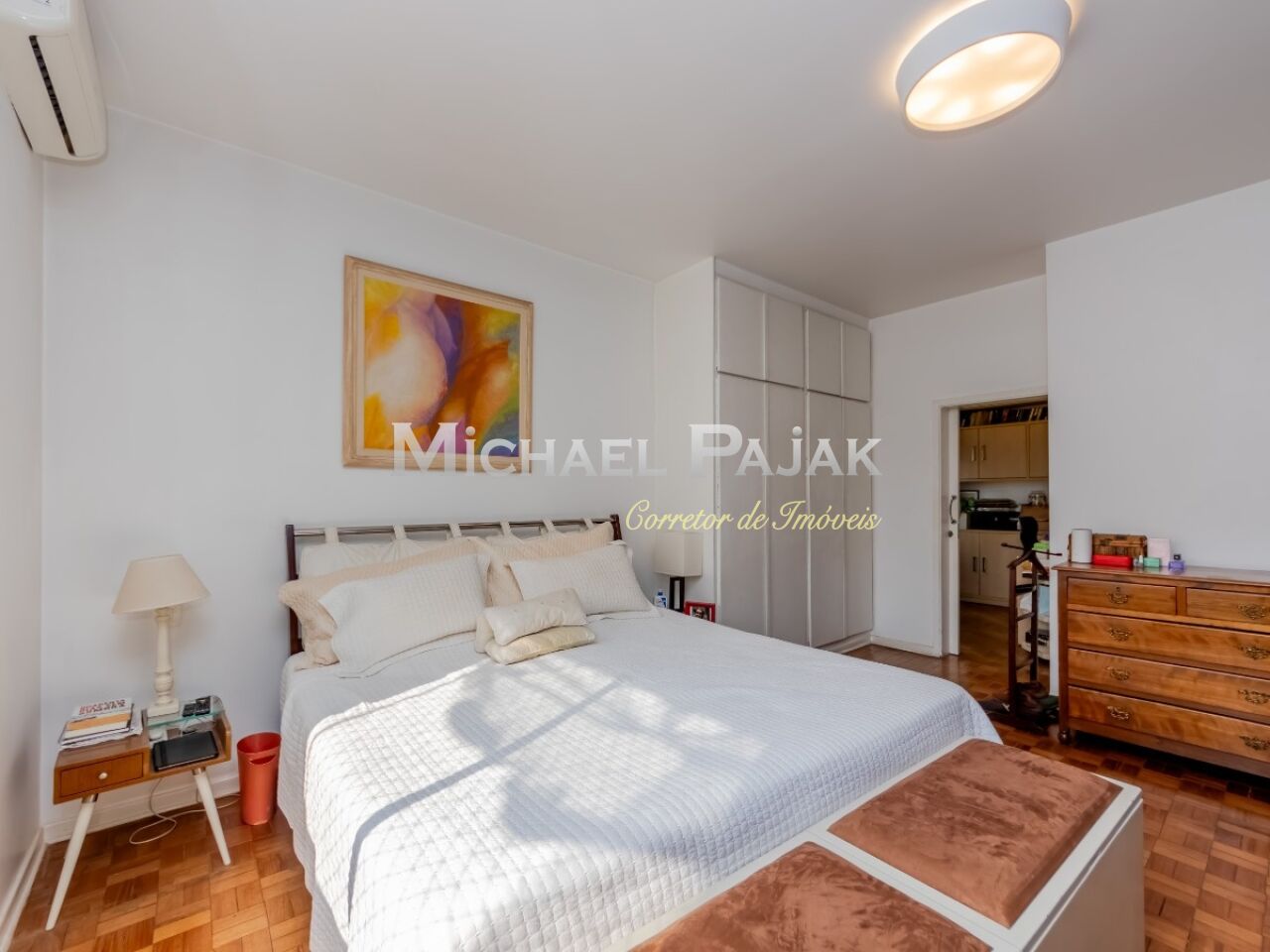 São três quartos grandes, todos suítes, com ar condicionado, armários e uma delas com amplo closet e espaço para escritório.
