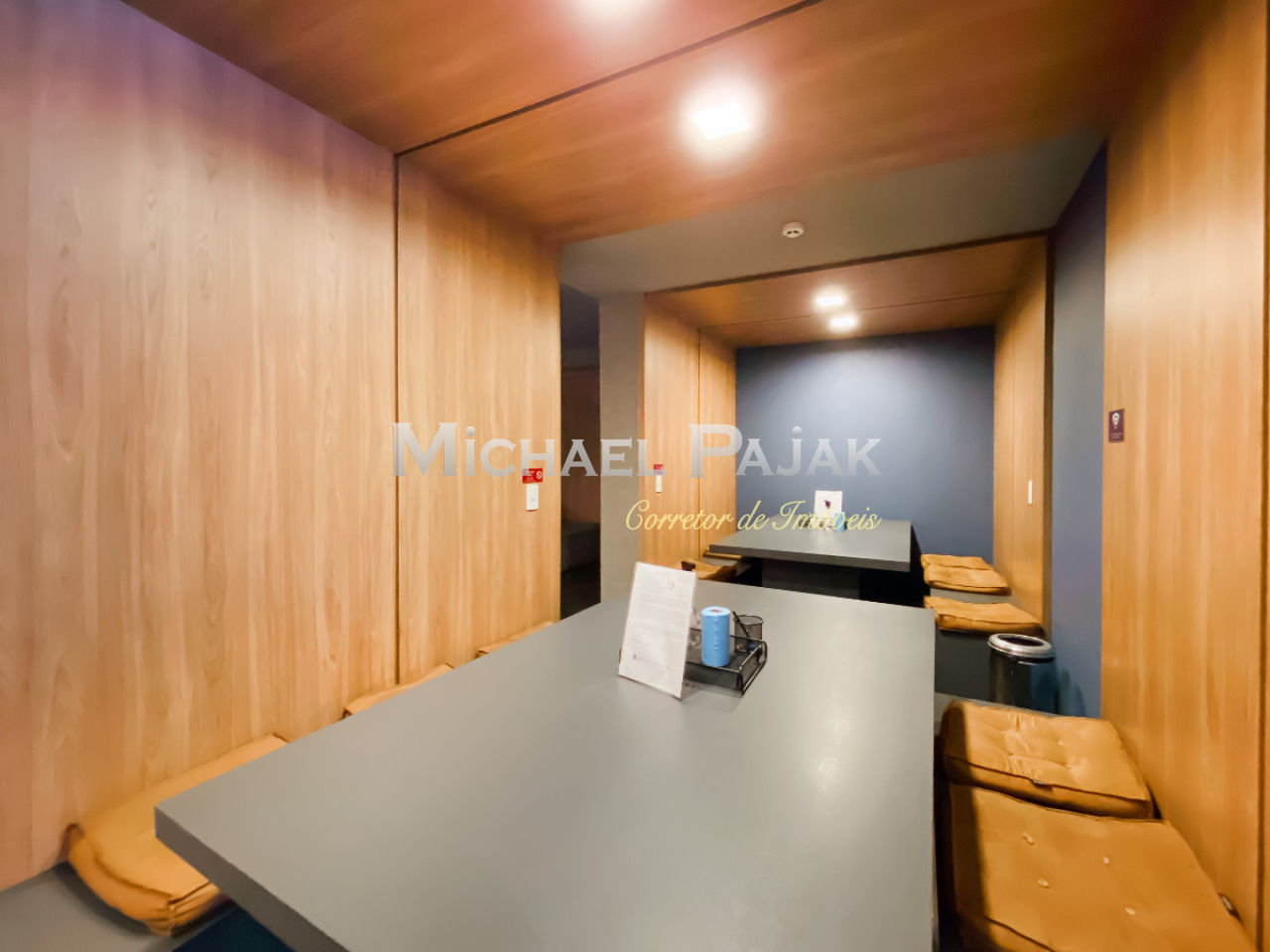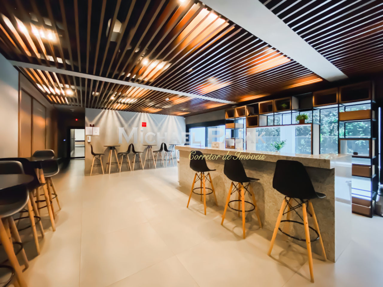 Salão de festas e coworking integrados ao design moderno do edifício