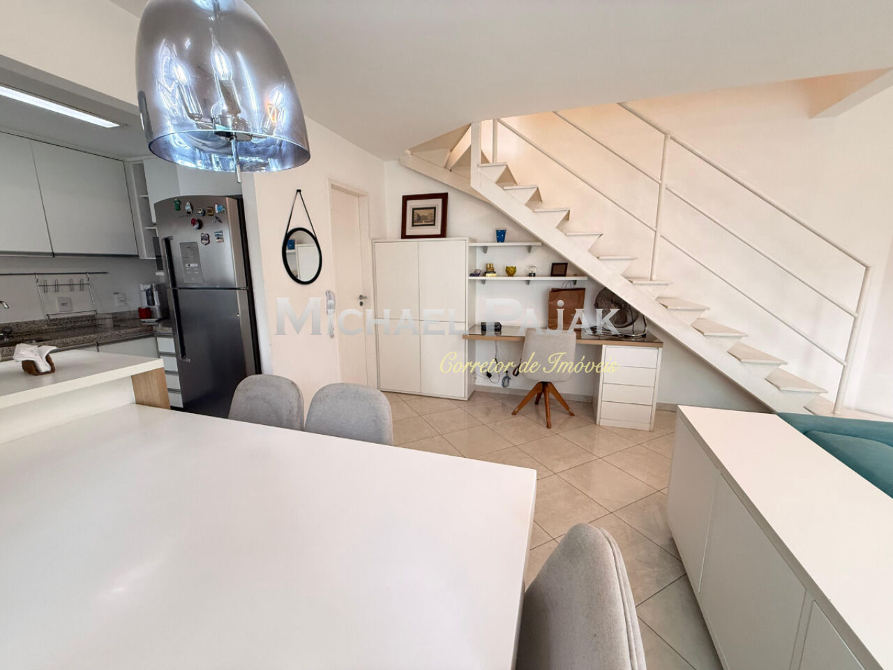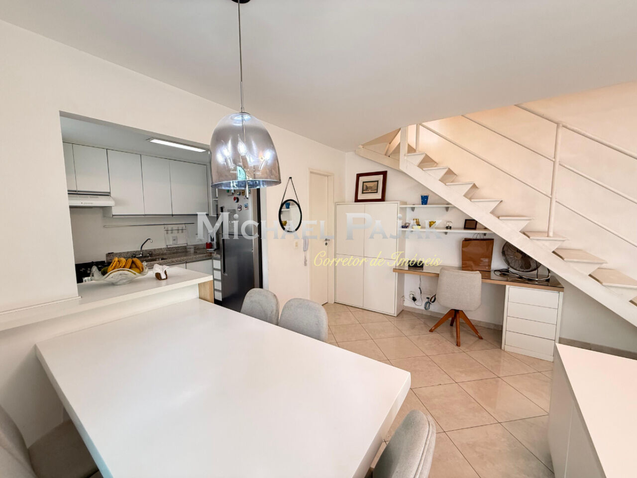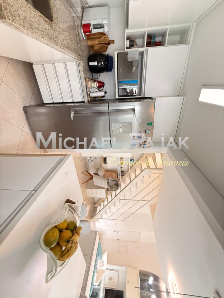 O andar inferior integra sala de estar, lavabo e um espaço versátil para home office, além de lavanderia funcional e cozinha planejada. No piso superior, a ampla suíte com closet garante total privacidade e uma vista para a cidade.