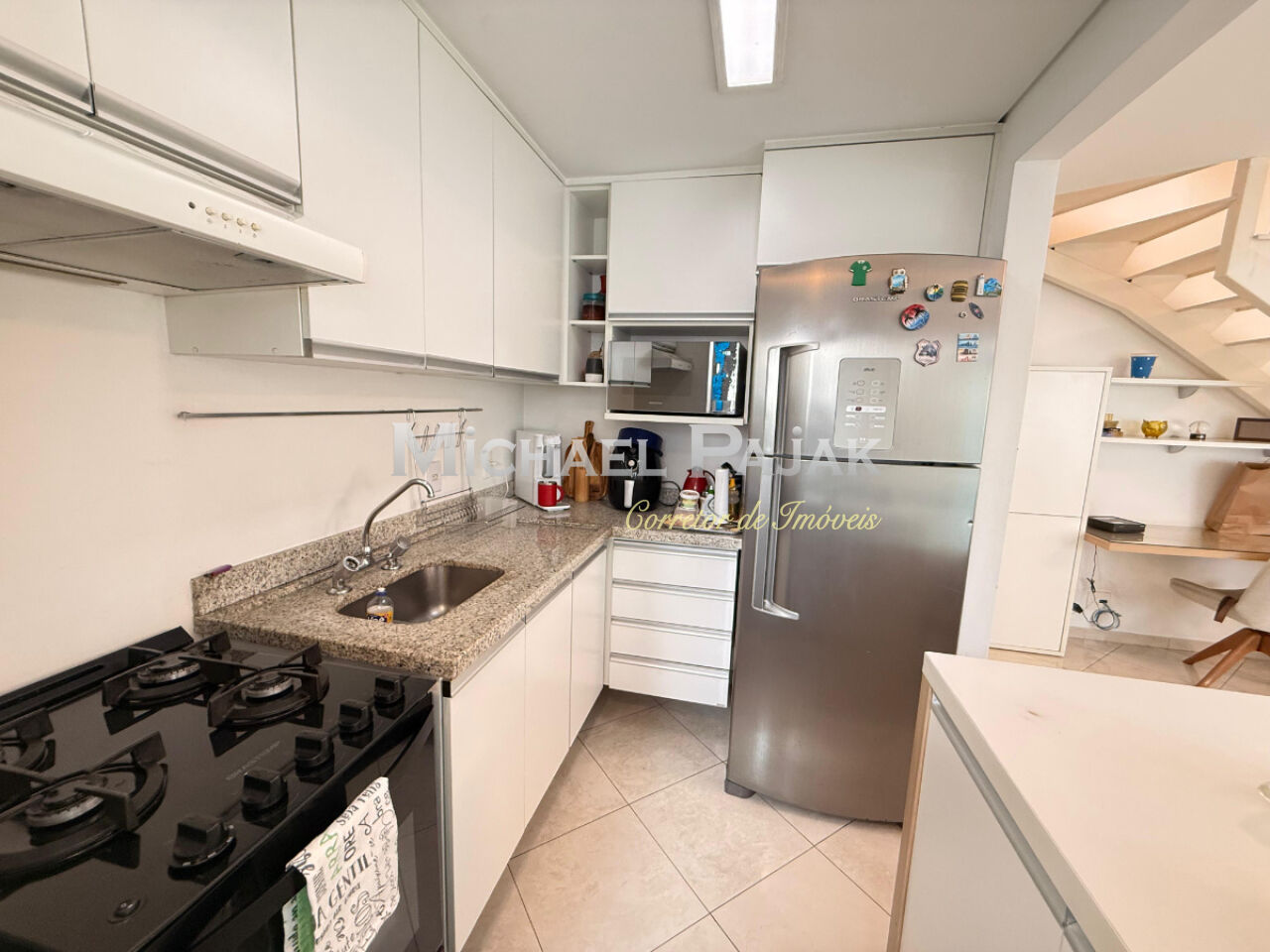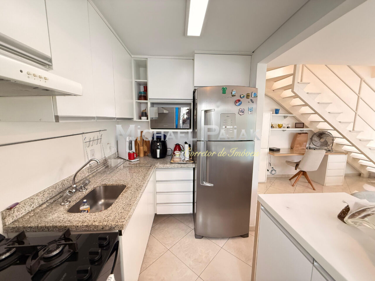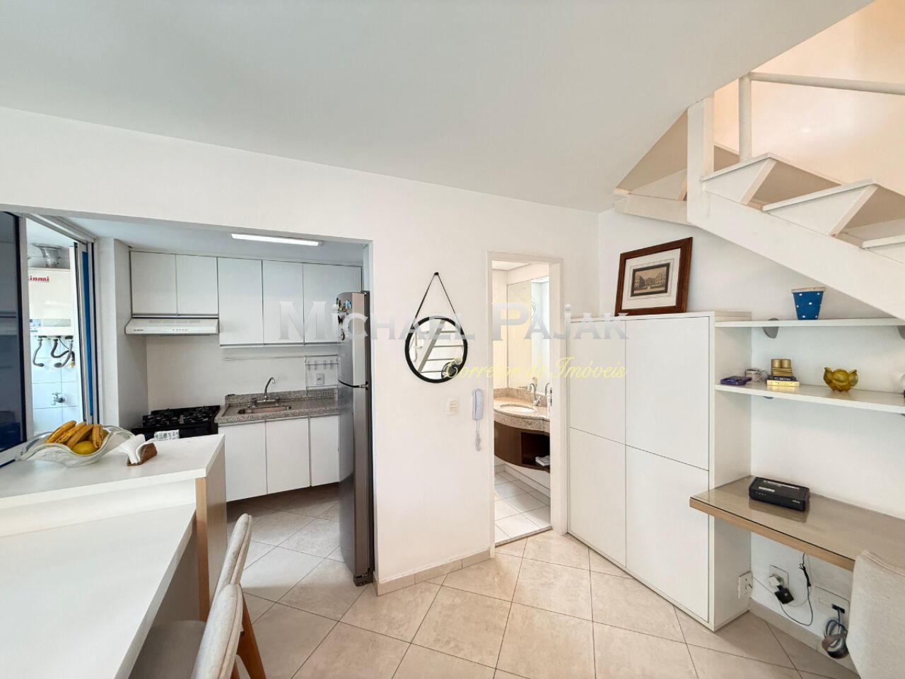 O andar inferior integra sala de estar, lavabo e um espaço versátil para home office, além de lavanderia funcional e cozinha planejada. No piso superior, a ampla suíte com closet garante total privacidade e uma vista para a cidade.