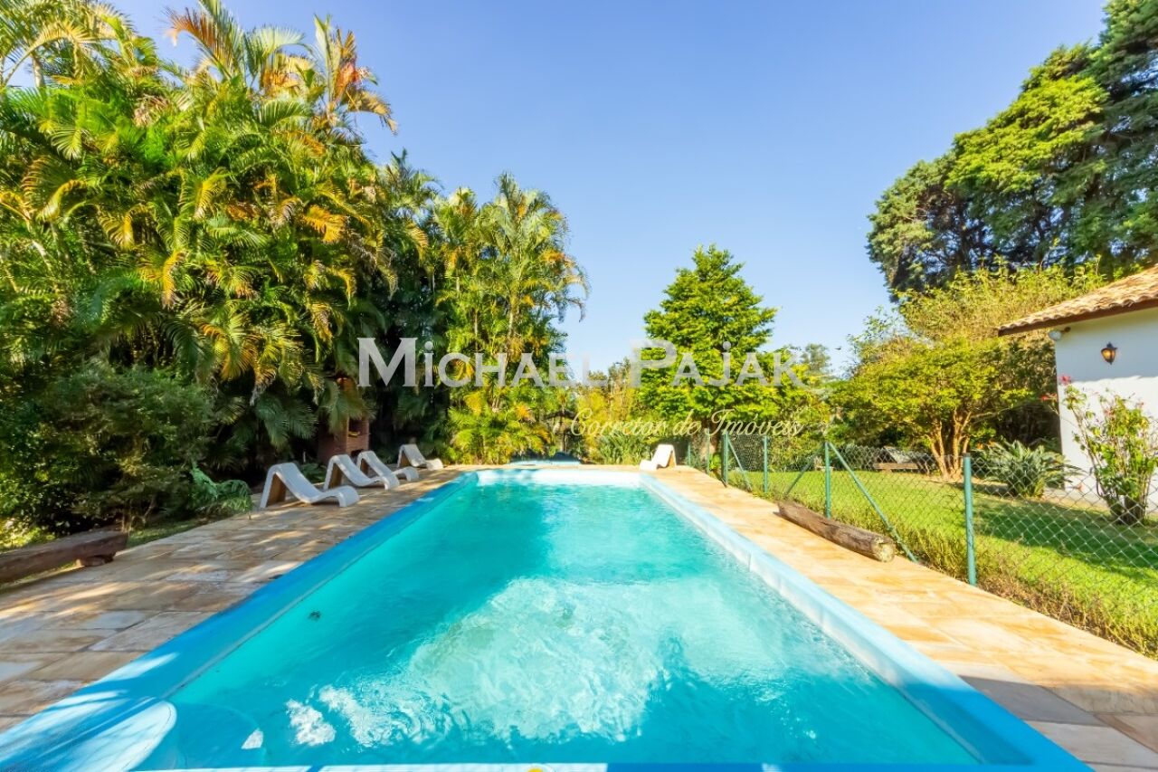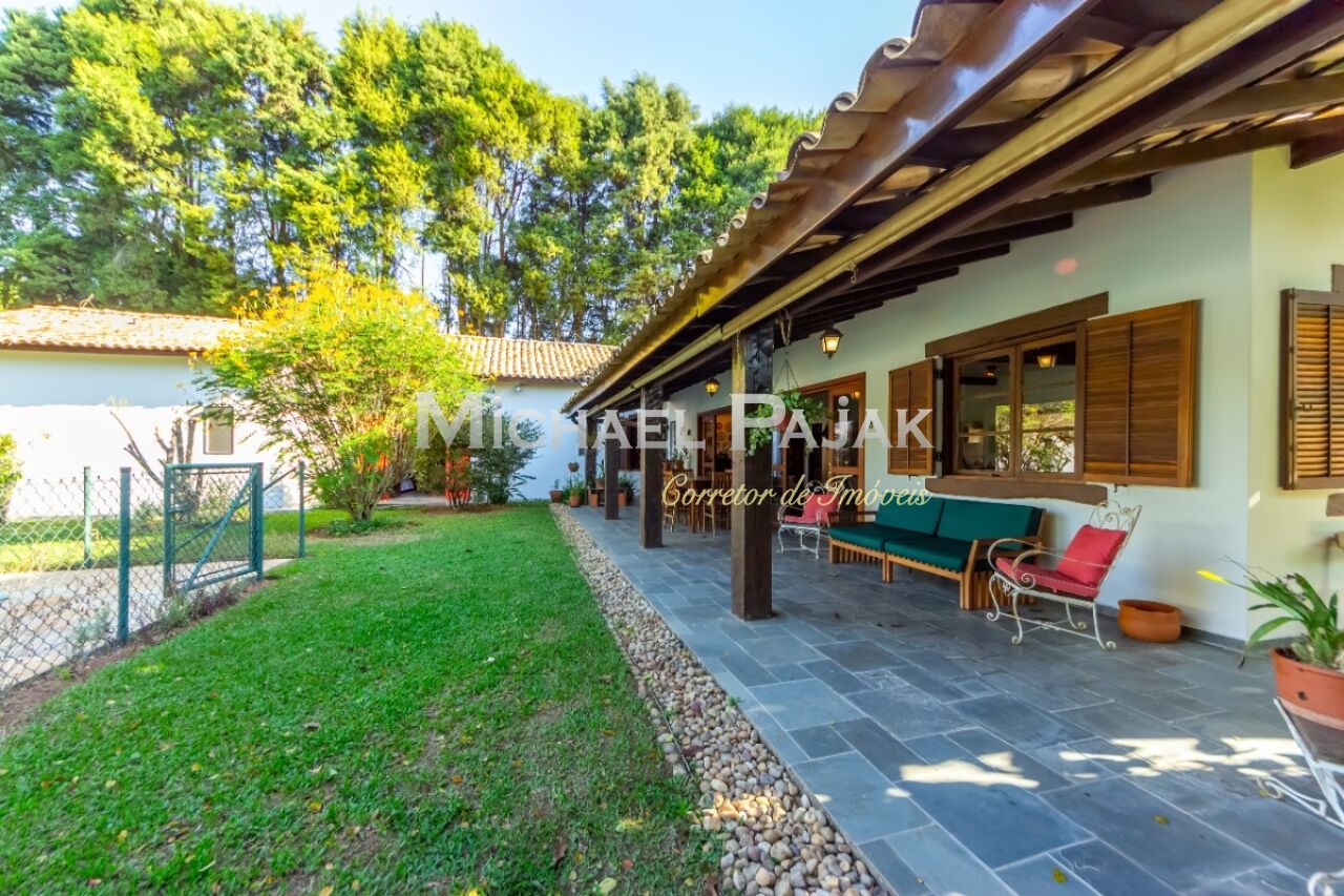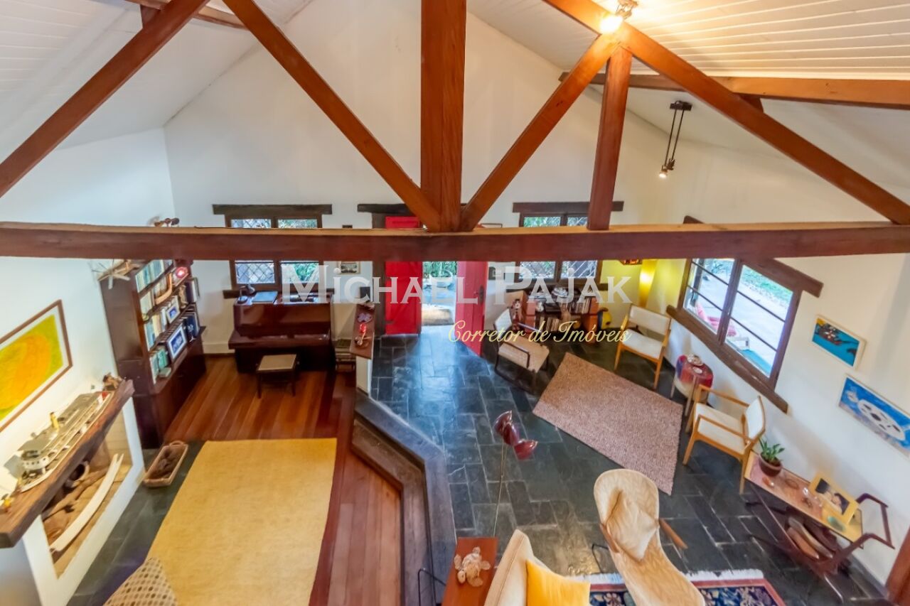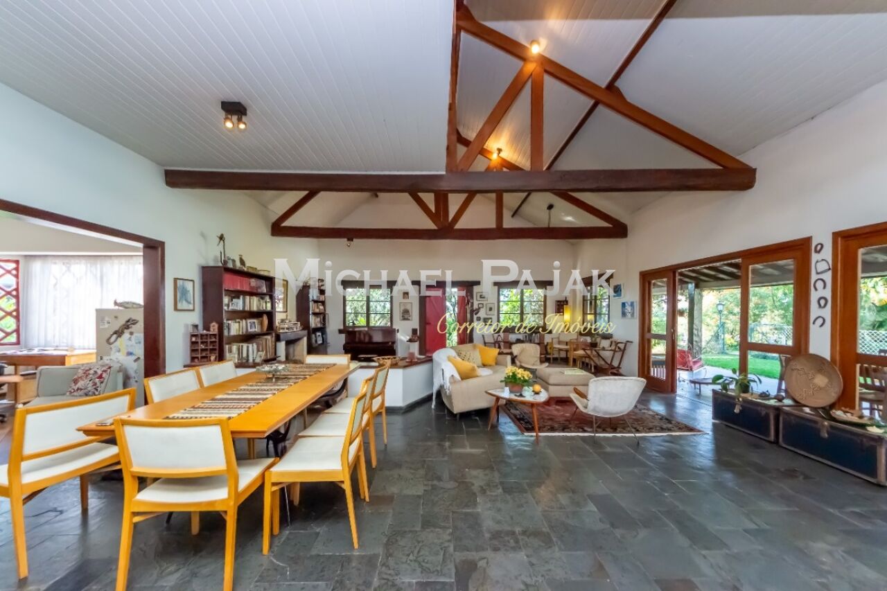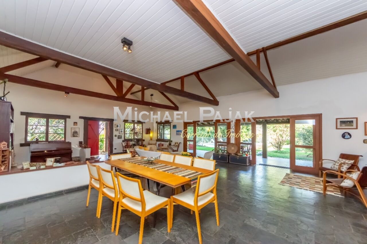 A arquitetura colonial, evidenciada pelas vigas de madeira maciça e janelas amplas, confere um charme único a esta residência. O piso em madeira e pedra adiciona uma sensação de rusticidade elegante.