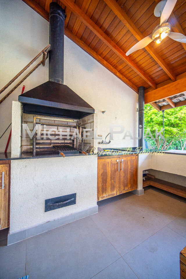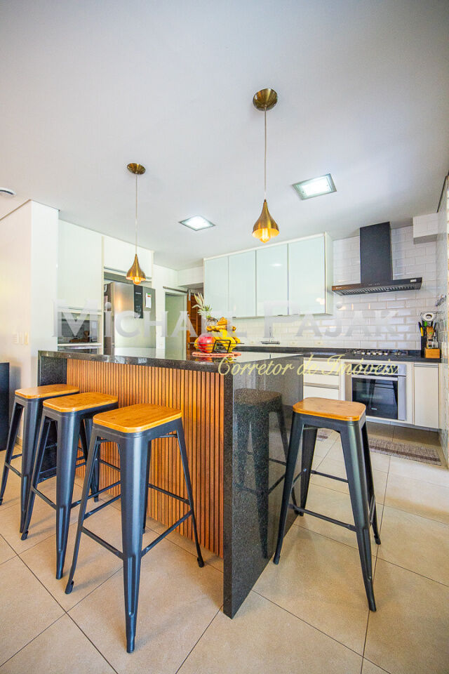 A cozinha americana é moderna e funcional, equipada com ilha central e armários planejados de alta qualidade. Integrada à varanda gourmet com churrasqueira e forno à lenha, é o espaço perfeito para receber amigos e familiares.