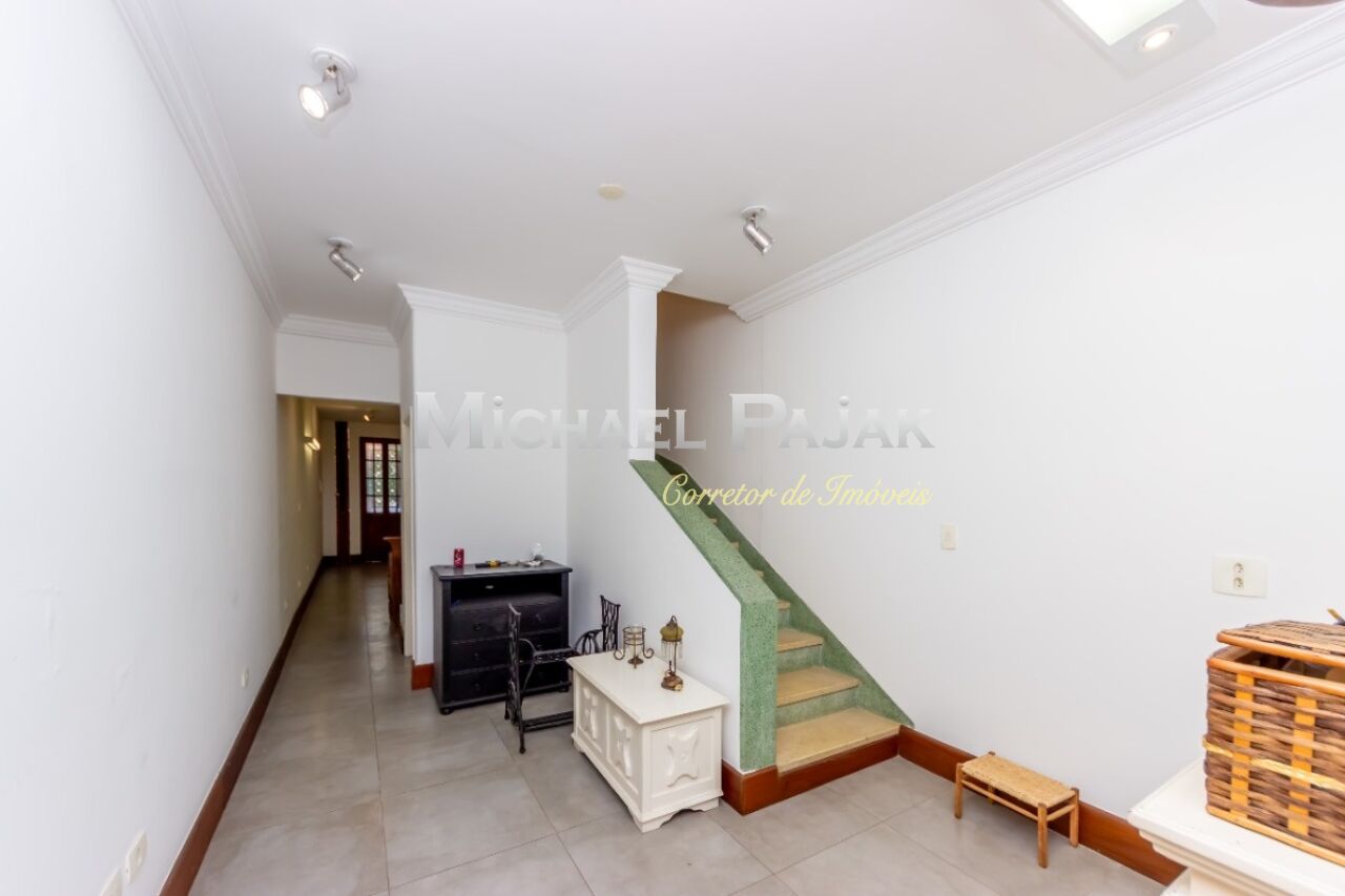 Na parte de baixo, linda porta de entrada de madeira pinho de riga e vitral combinam harmoniosamente com a fachada de tijolinhos e sala ampla com piso claro e cozinha, que completam a planta deste charmoso imóvel, com 1 vaga de garagem.